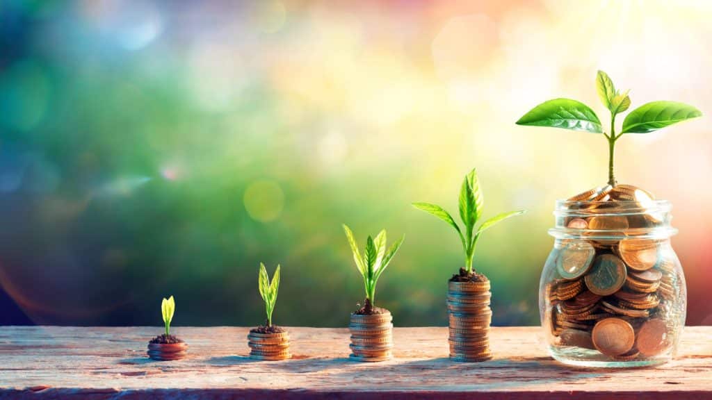 Jar filled with coins that sprout into a plant. symbolizing money growth.