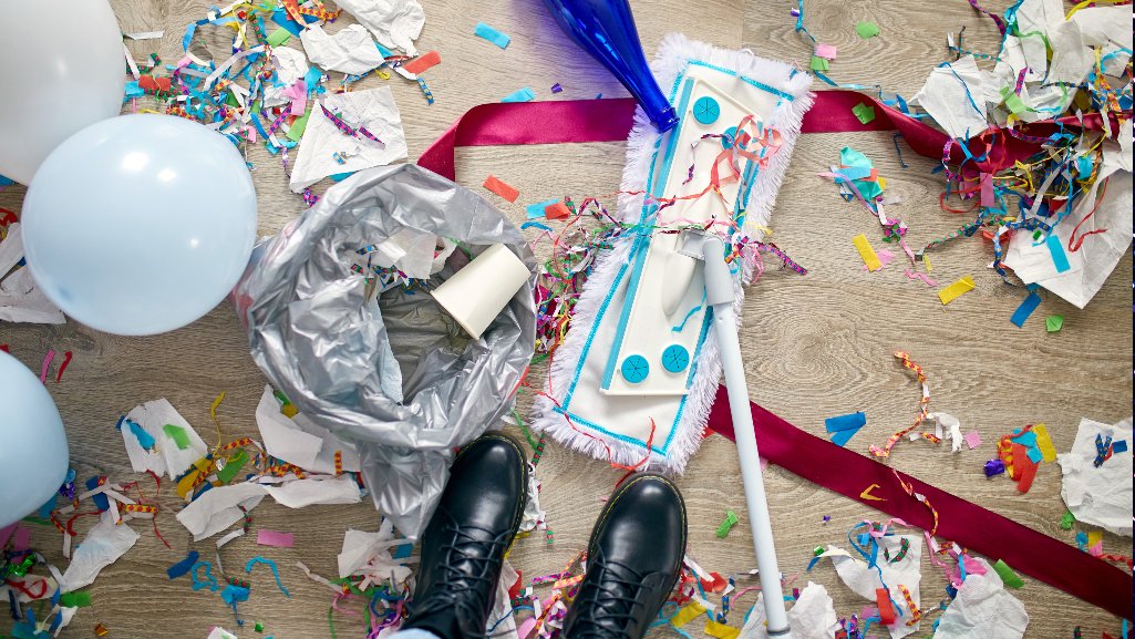 Person cleaning up balloons and confetti after a holiday party, symbolizing getting finances back on track after post-holiday spending.